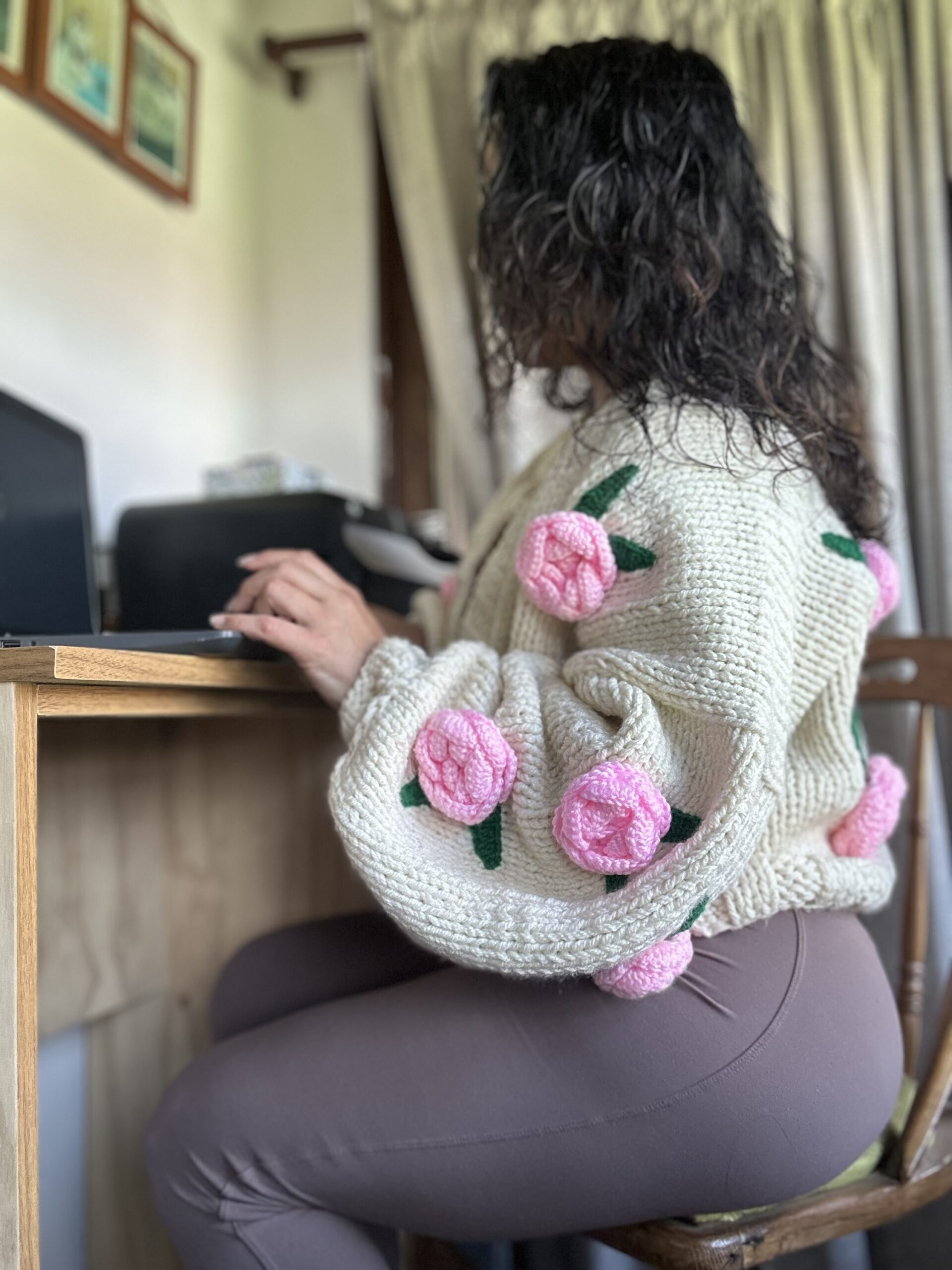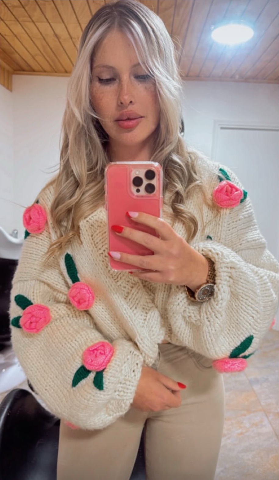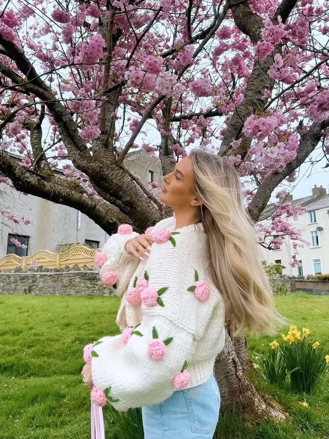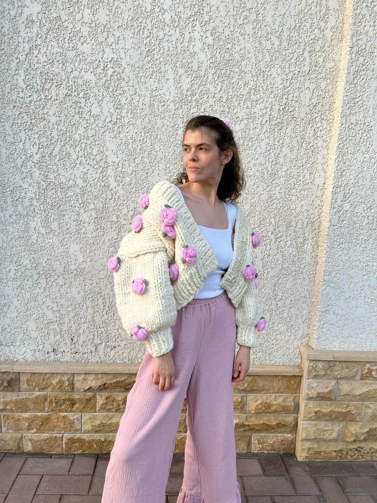 Un delicado cárdigan atemporal en color crema o blanco invierno con rosas.