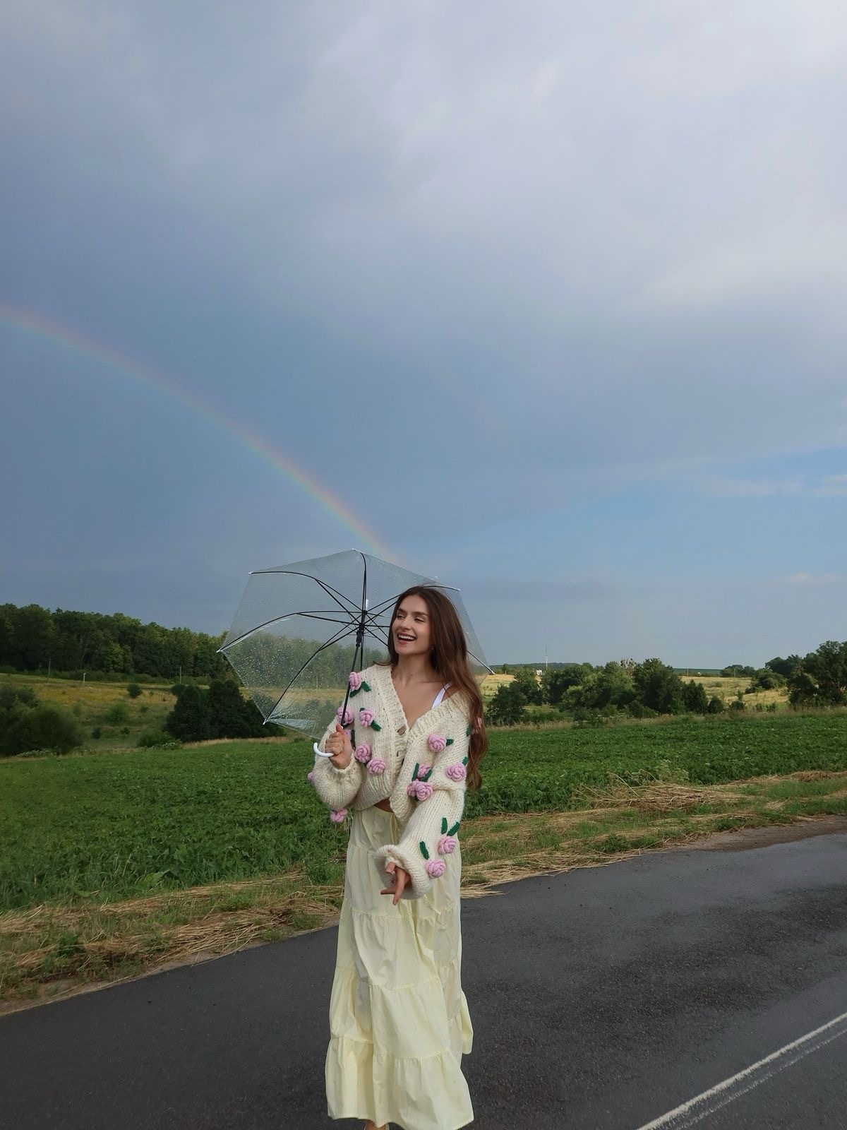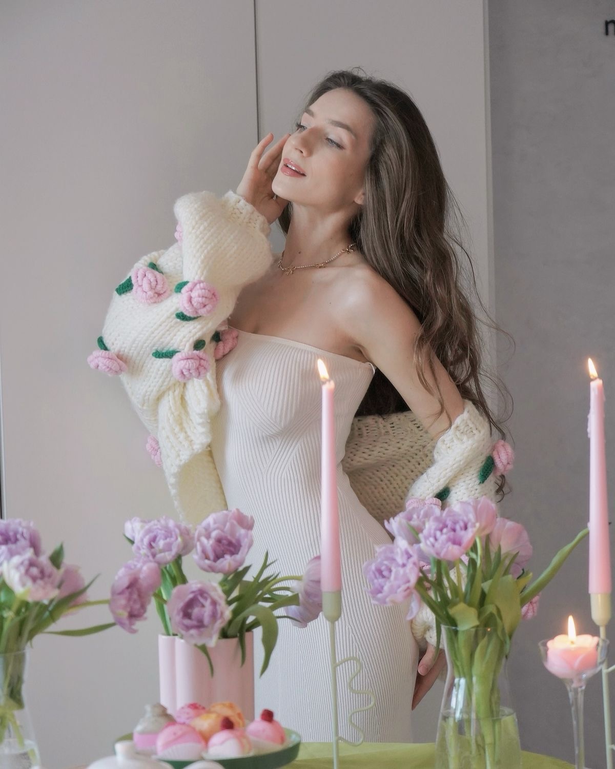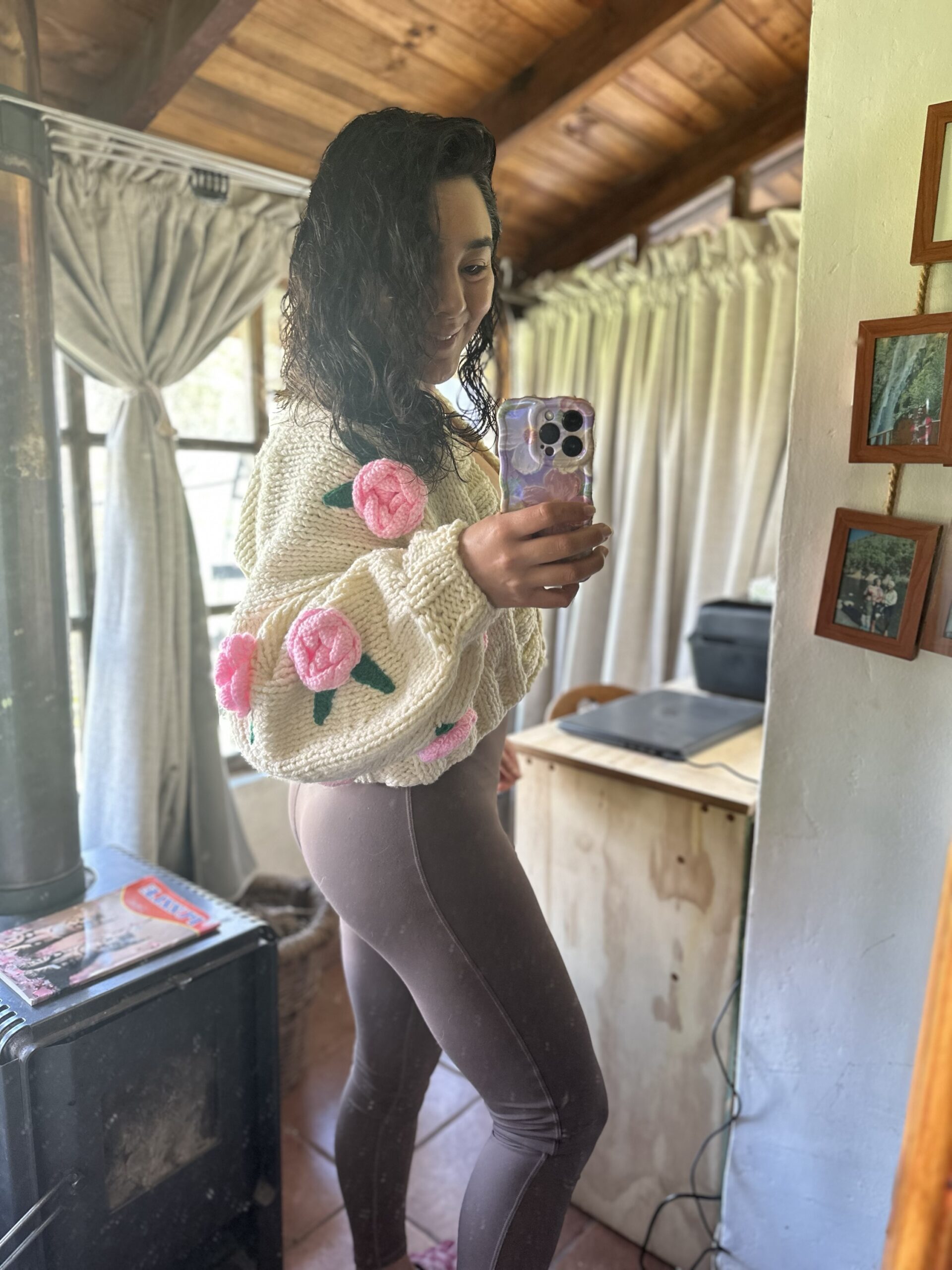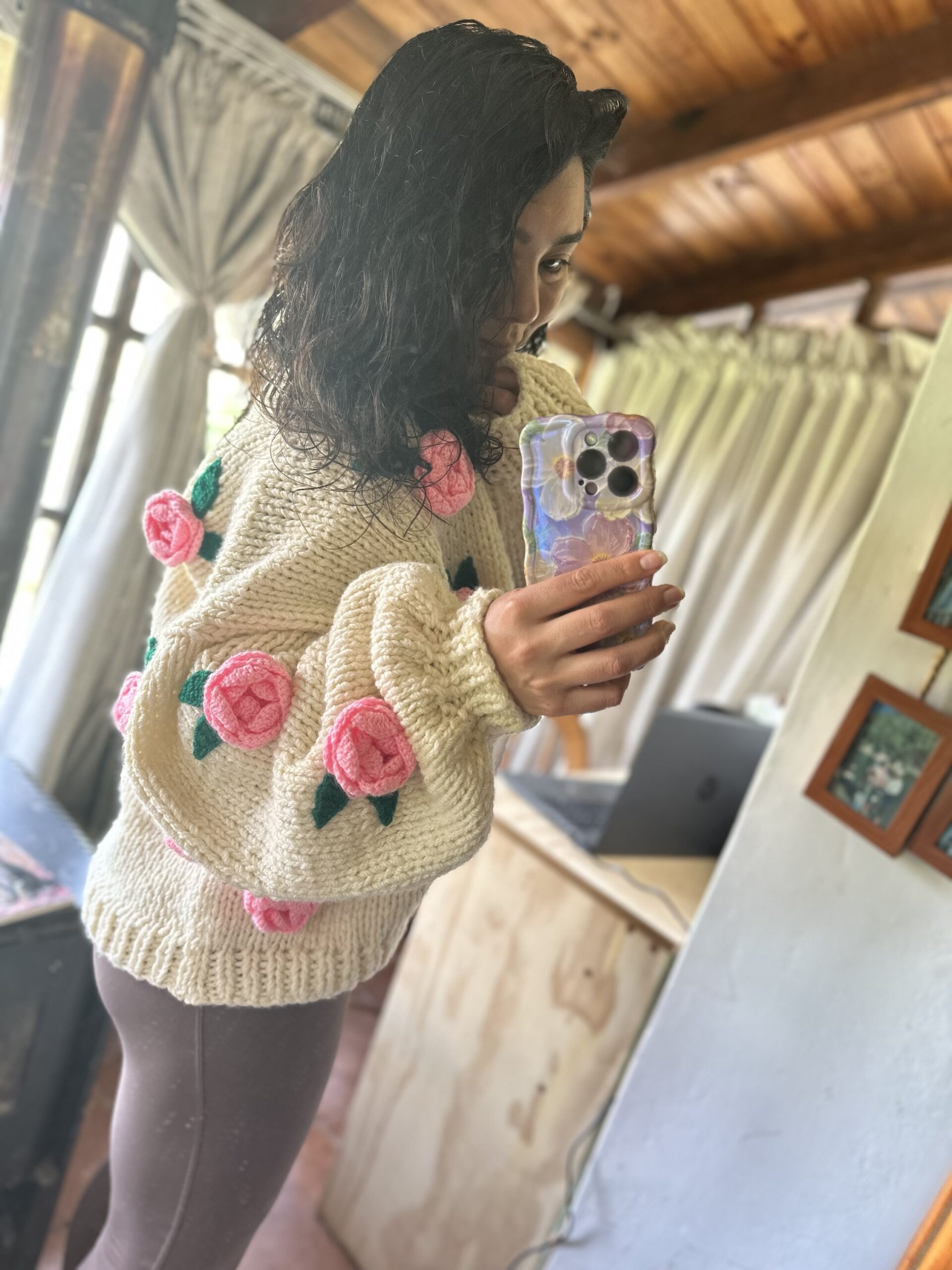 Un delicado cárdigan atemporal en color crema o blanco invierno con rosas.
