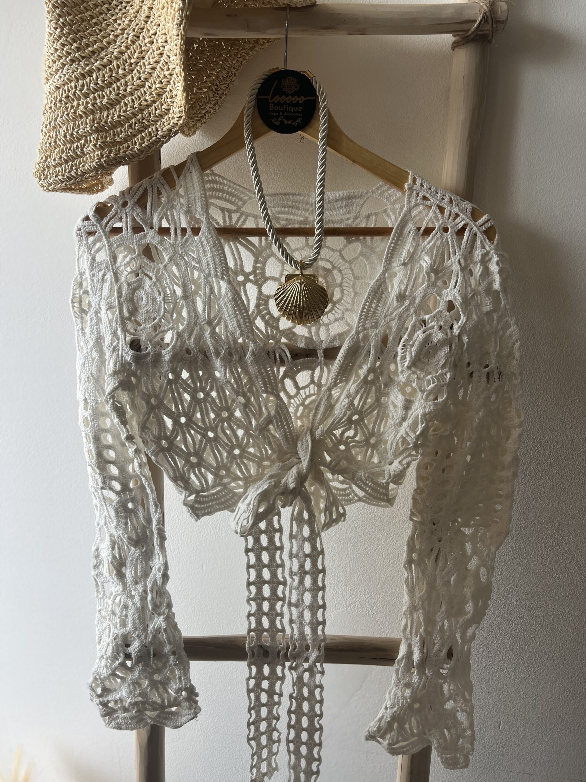 Un top cruzado de encaje, en maquinaria textil con lazo ancho para cruzar en la cintura.