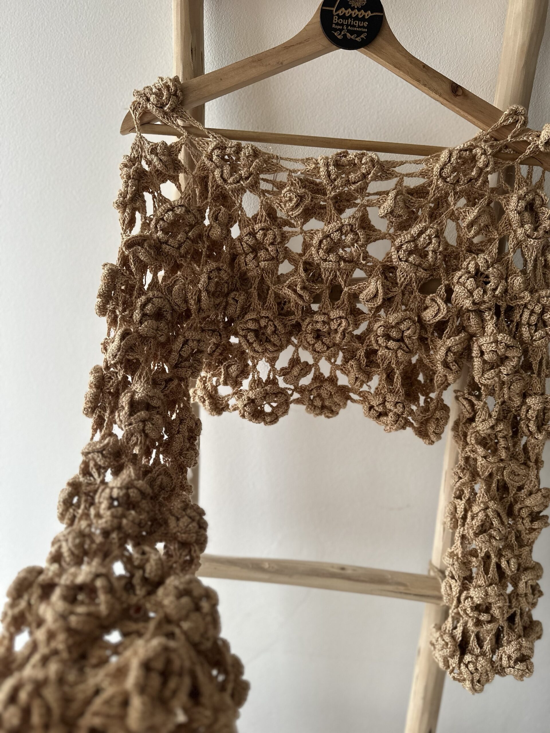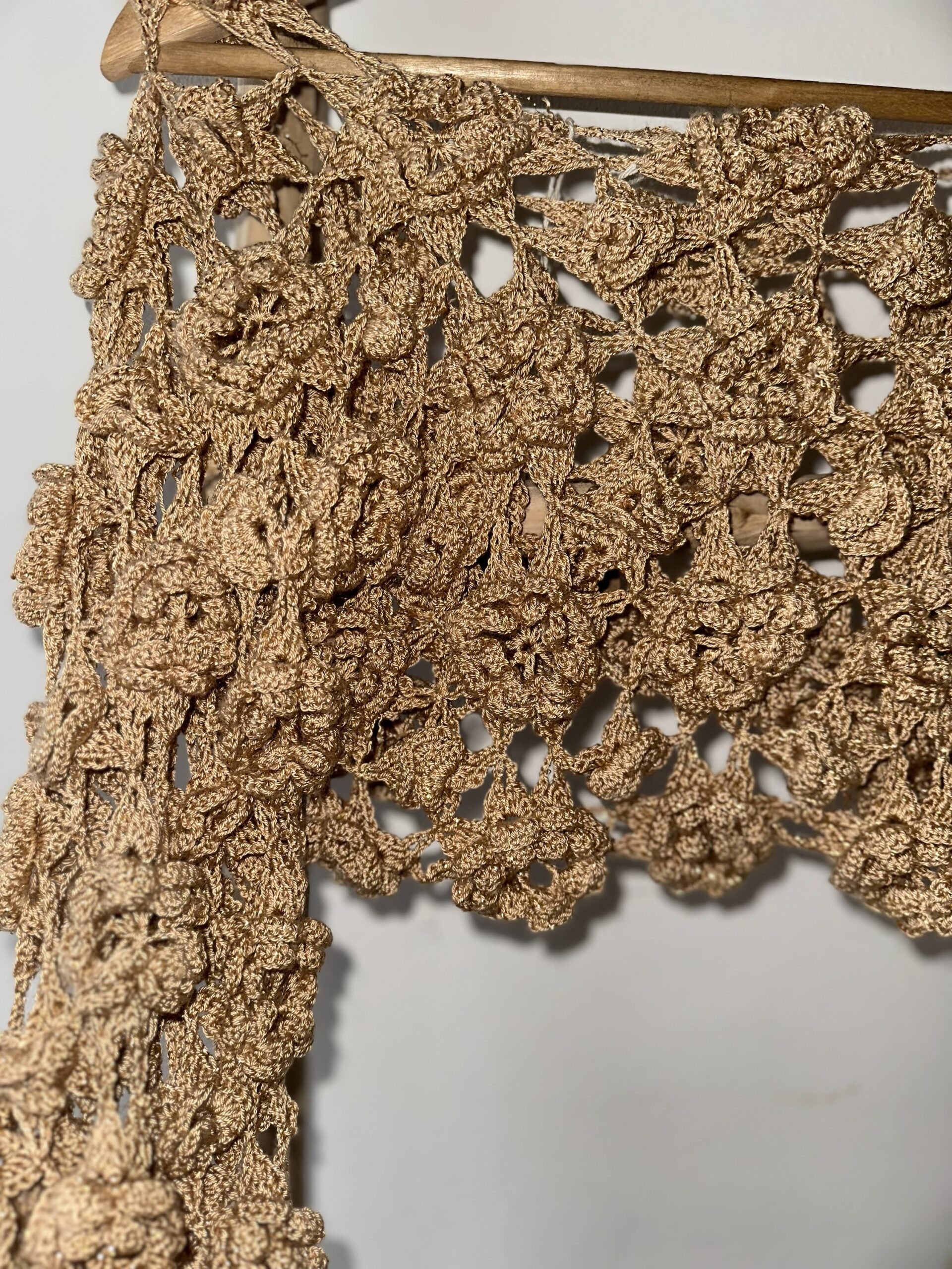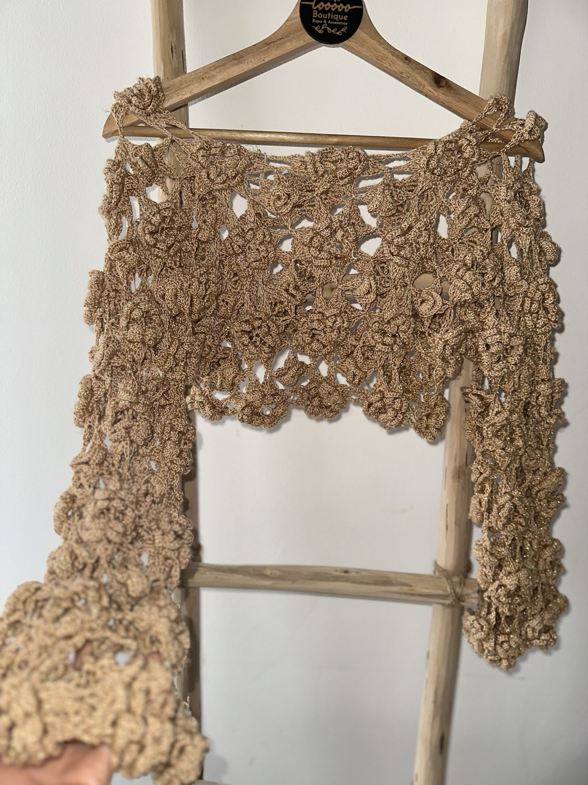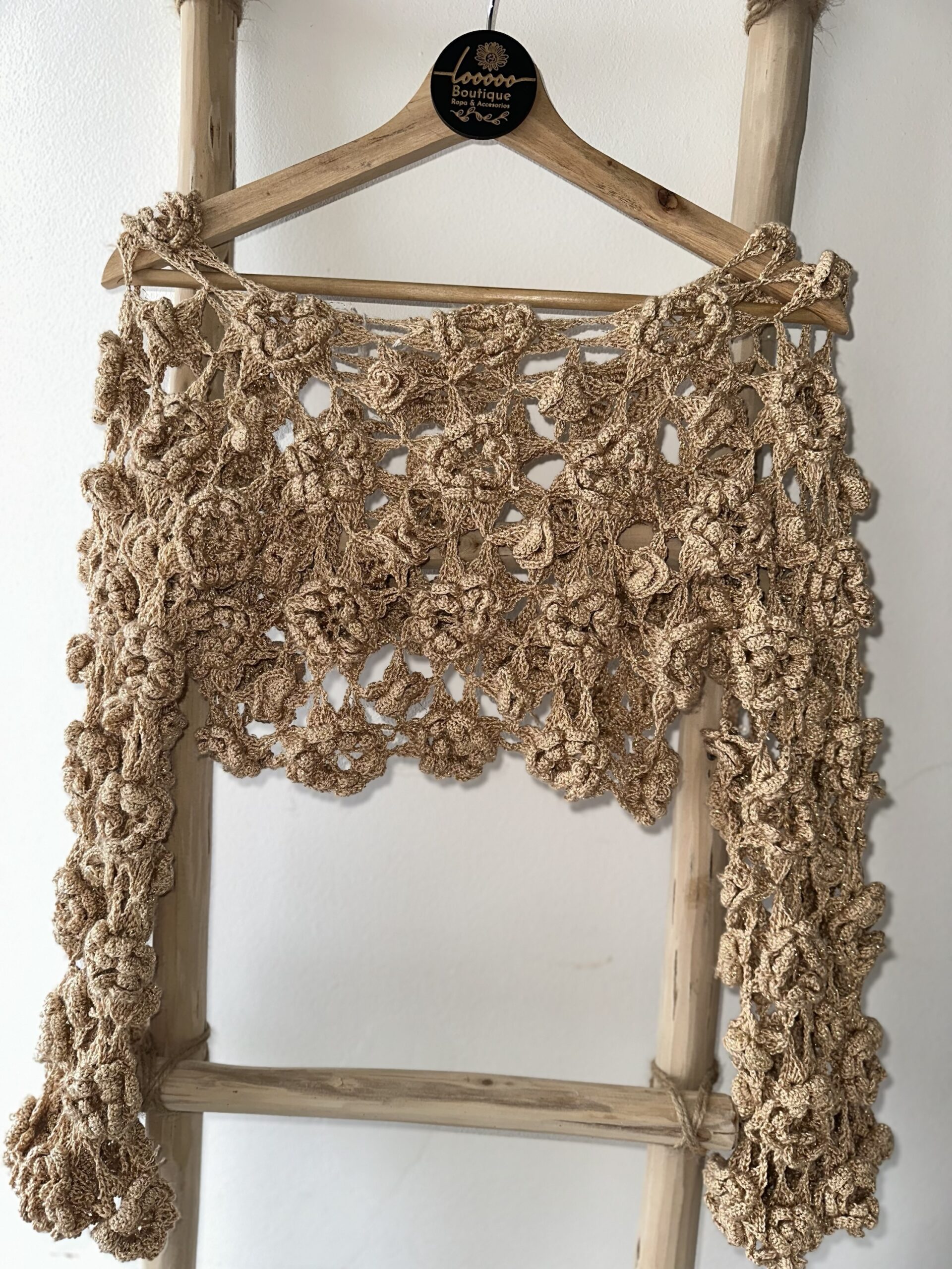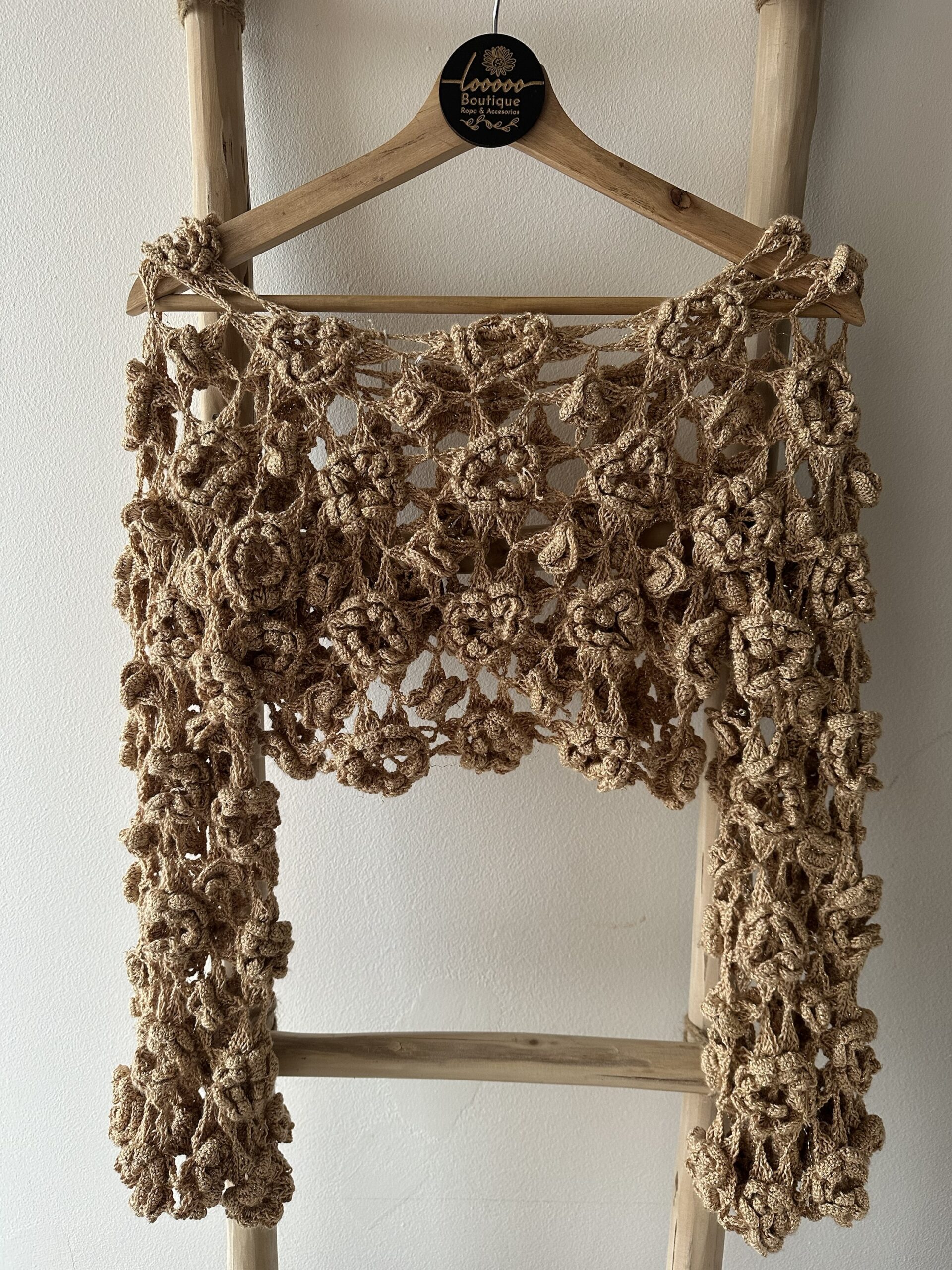 Top / sweater manga larga y acampanada, texturizado con flores en color beige y brillo. Stock de edición limitada.