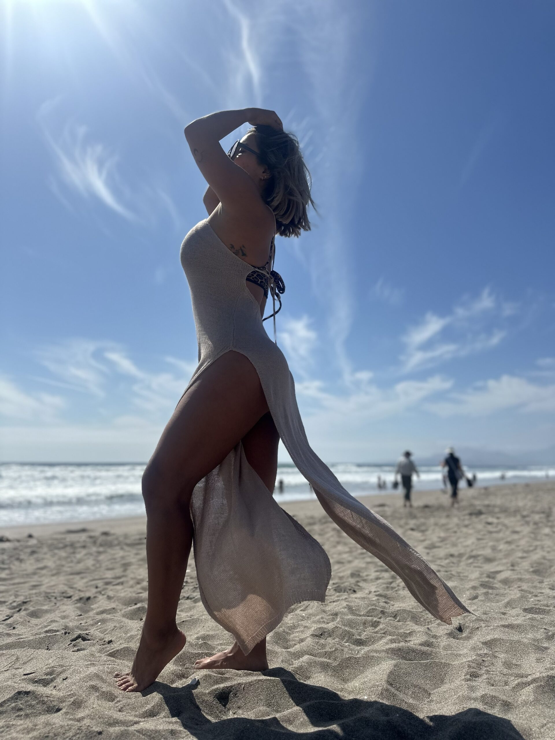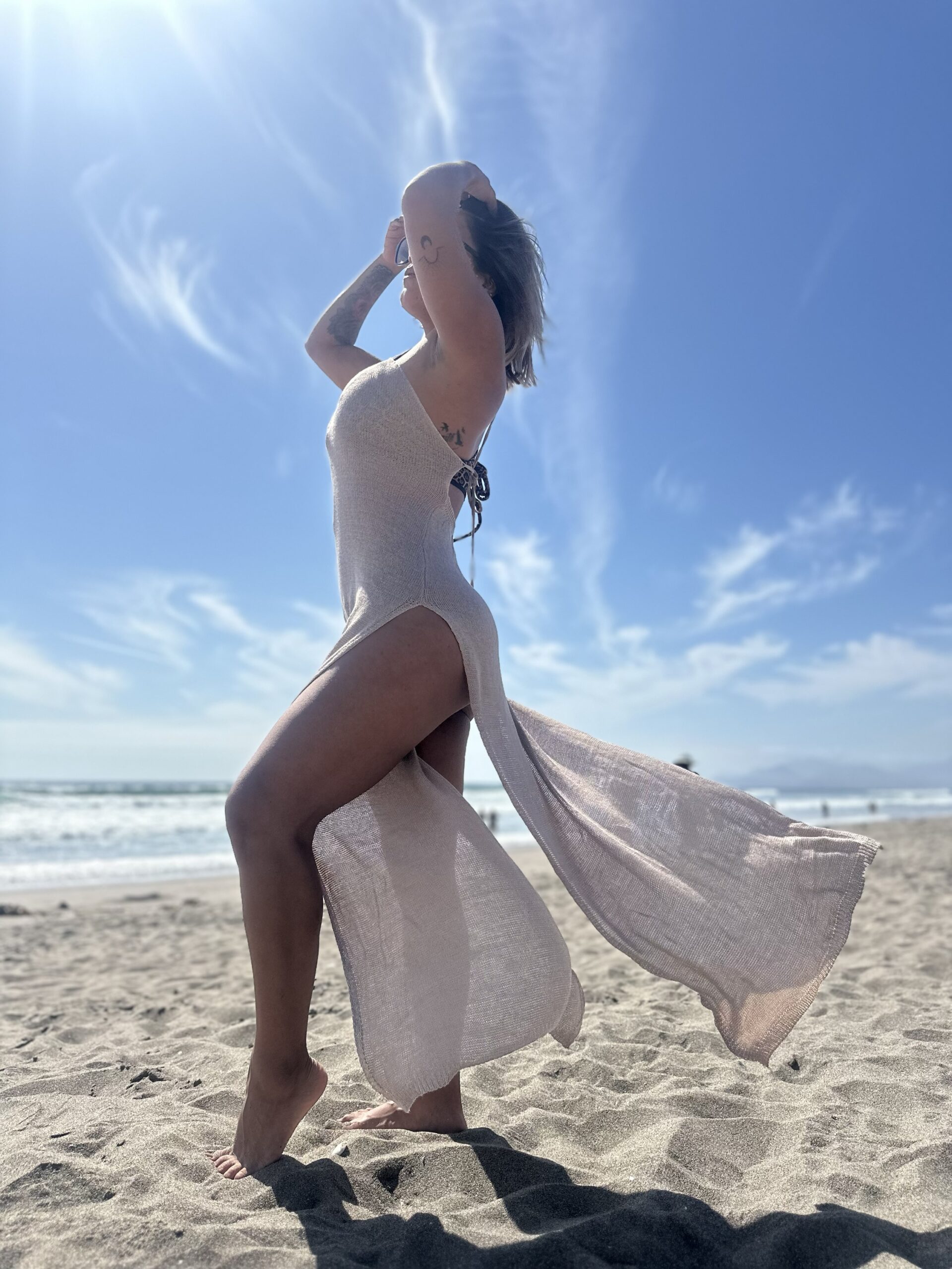 Un lindo vestido o salida de baño en color beige semitransparente.